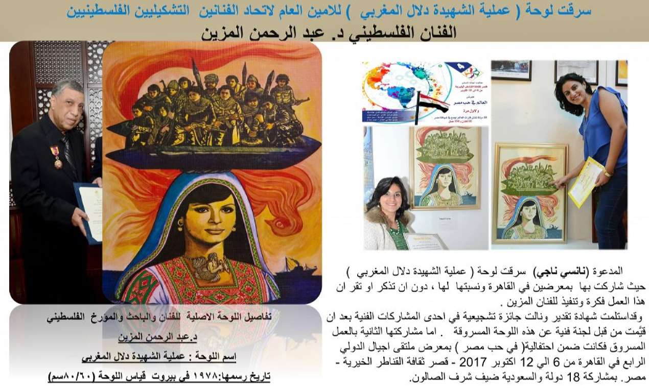 احيطكم علما باننا بتاريخ 22.10.2017 اكتشفنا ان المدعوة (نانسي ناجي) سرقت لوحة ( عملية الشهيدة دلال المغربي ) للفنان والباحث