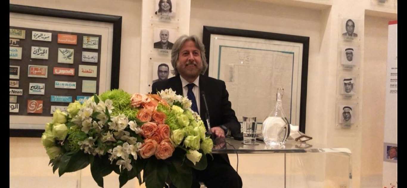 حاضر الإعلامي اللبناني الدكتور جمال فياض في مركز الشيخ ابراهيم بن محمد آل خليفة للثقافة والبحوث، في المنامة عاصمة مملكة