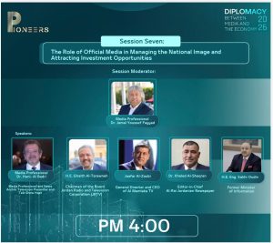 في إطار مؤتمر الدبلوماسية والإعلام والتنمية والاستثمار، الذي أُقيم في العاصمة الأردنية عمّان في فندق سانت ريجيس، شهدت قاعة المؤتمرات ندوة إعلامية متخصصة بعنوان «دور وسائل الإعلام الرسمية في إدارة الصورة الوطنية وجذب فرص الاستثمار»، قدّمها وأدارها الإعلامي اللبناني الدكتور جمال فياض.