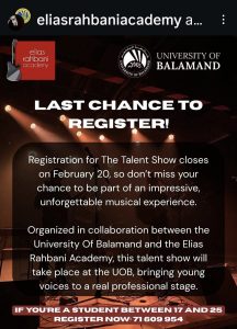 أعلنت أكاديمية الياس الرحباني، بالتعاون مع جامعة البلمند، عن اقتراب موعد إقفال باب التسجيل للمشاركة في مسابقة “Talent Show”، محددةً تاريخ 20 فبراير/شباط كآخر مهلة للراغبين في الانضمام إلى الحدث الفني.